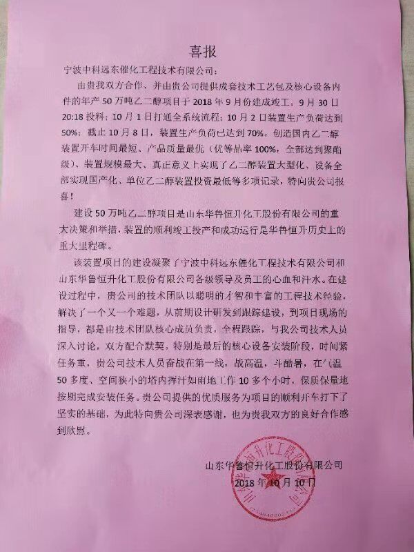 在設(shè)計(jì)和建設(shè)過(guò)程中,中科遠(yuǎn)東的設(shè)計(jì)團(tuán)隊(duì)以聰明的才智和豐富的設(shè)計(jì)經(jīng)驗(yàn),解決了一個(gè)又一個(gè)難題,從前期設(shè)計(jì)研發(fā)到跟蹤建設(shè),到開車現(xiàn)場(chǎng)的指導(dǎo),都是由技術(shù)團(tuán)隊(duì)核心成員負(fù)責(zé),全程跟蹤,與華魯恒升技術(shù)人員深入討論,雙方配合默契。為此,山東華魯恒升化工股份有限公司公司發(fā)來(lái)喜報(bào),感謝寧波中科遠(yuǎn)東催化工程技術(shù)有限公司在此過(guò)程中提供的優(yōu)質(zhì)技術(shù)和優(yōu)良服務(wù)。